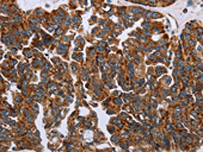 The image on the left is immunohistochemistry of paraffin-embedded Human ovarian cancer tissue using CSB-PA834150(HSD3B2 Antibody) at dilution 1/20, on the right is treated with fusion protein. (Original magnification: ×200)