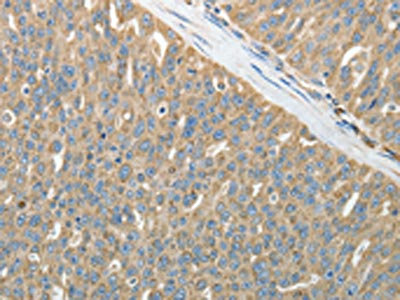 The image on the left is immunohistochemistry of paraffin-embedded Human ovarian cancer tissue using CSB-PA088395(HSP90B1 Antibody) at dilution 1/50, on the right is treated with fusion protein. (Original magnification: ×200)