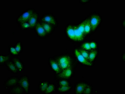 • Immunofluorescence staining of HepG2 cells with CSB-PA010967LA01HU at 1:333, counter-stained with DAPI. The cells were fixed in 4% formaldehyde, permeabilized using 0.2% Triton X-100 and blocked in 10% normal Goat Serum. The cells were then incubated with the antibody overnight at 4°C. The secondary antibody was Alexa Fluor 488-congugated AffiniPure Goat Anti-Rabbit IgG(H+L).