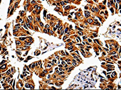 • The image on the left is immunohistochemistry of paraffin-embedded Human lung cancer tissue using CSB-PA058807(IL13RA1 Antibody) at dilution 1/50, on the right is treated with fusion protein. (Original magnification: ×200)