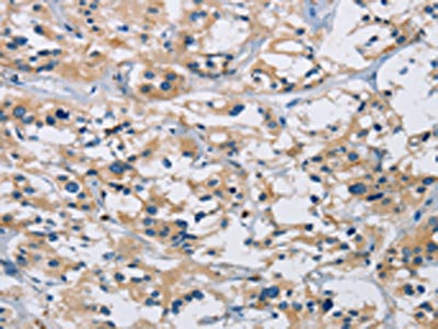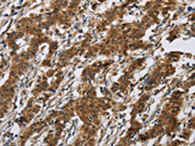 • The image on the left is immunohistochemistry of paraffin-embedded Human gastic cancer tissue using CSB-PA121041(IL17RB Antibody) at dilution 1/40, on the right is treated with synthetic peptide. (Original magnification: ×200)