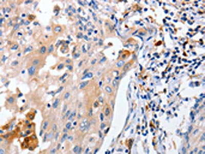 The image on the left is immunohistochemistry of paraffin-embedded Human cervical cancer tissue using CSB-PA634259(IL18 Antibody) at dilution 1/100, on the right is treated with fusion protein. (Original magnification: ×200)