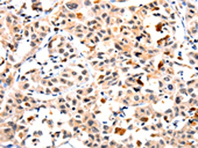 • The image on the left is immunohistochemistry of paraffin-embedded Human lung cancer tissue using CSB-PA929770(IL23R Antibody) at dilution 1/10, on the right is treated with fusion protein. (Original magnification: ×200)
