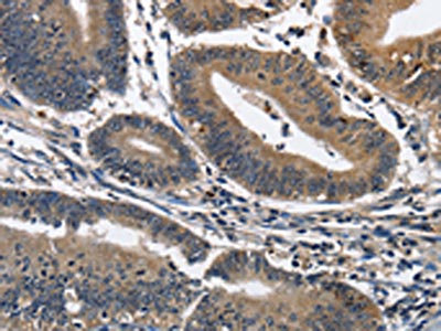 • The image on the left is immunohistochemistry of paraffin-embedded Human colon cancer tissue using CSB-PA114100(IL2RB Antibody) at dilution 1/60, on the right is treated with fusion protein. (Original magnification: ×200)