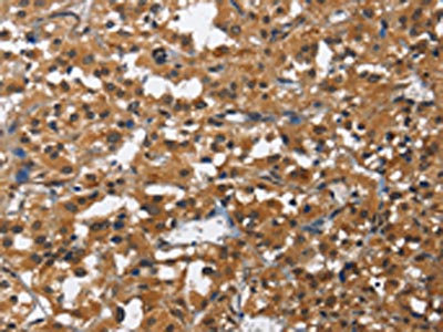 • The image on the left is immunohistochemistry of paraffin-embedded Human thyroid cancer tissue using CSB-PA114100(IL2RB Antibody) at dilution 1/60, on the right is treated with fusion protein. (Original magnification: ×200)