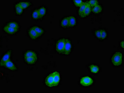 Immunofluorescent analysis of HepG2 cells using CSB-PA011659YA01HU at dilution of 1:100 and Alexa Fluor 488-congugated AffiniPure Goat Anti-Rabbit IgG(H+L)