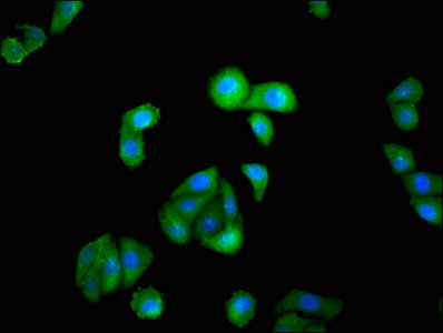 Immunofluorescence staining of HepG2 cells with CSB-PA011824LA01HU at 1:100, counter-stained with DAPI. The cells were fixed in 4% formaldehyde, permeabilized using 0.2% Triton X-100 and blocked in 10% normal Goat Serum. The cells were then incubated with the antibody overnight at 4°C. The secondary antibody was Alexa Fluor 488-congugated AffiniPure Goat Anti-Rabbit IgG(H+L).