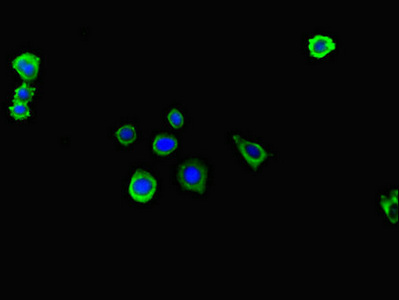 • Immunofluorescent analysis of HepG2 cells using CSB-PA011867LA01HU at dilution of 1:100 and Alexa Fluor 488-congugated AffiniPure Goat Anti-Rabbit IgG(H+L)