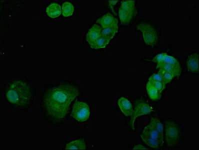 • Immunofluorescent analysis of MCF-7 cells using CSB-PA011868LA01HU at dilution of 1:100 and Alexa Fluor 488-congugated AffiniPure Goat Anti-Rabbit IgG(H+L)