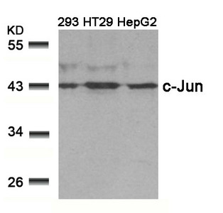 • Western blot analysis of extracts from 293, HT29 and HepG2 cells using c-Jun(Ab-239) Antibody.