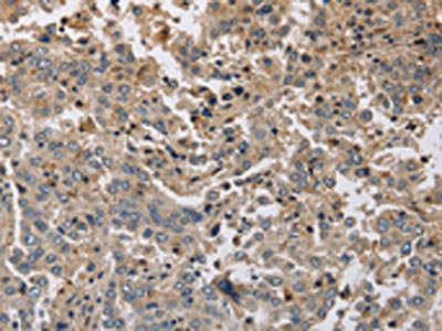 The image on the left is immunohistochemistry of paraffin-embedded Human liver cancer tissue using CSB-PA728154(KCND1 Antibody) at dilution 1/20, on the right is treated with synthetic peptide. (Original magnification: ×200)