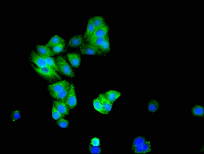 • Immunofluorescent analysis of HepG2 cells using CSB-PA012045LA01HU at dilution of 1:100 and Alexa Fluor 488-congugated AffiniPure Goat Anti-Rabbit IgG(H+L)