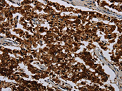 • The image on the left is immunohistochemistry of paraffin-embedded Human liver cancer tissue using CSB-PA990038(KLK11 Antibody) at dilution 1/50, on the right is treated with fusion protein. (Original magnification: ×200)