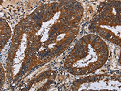 • The image on the left is immunohistochemistry of paraffin-embedded Human colon cancer tissue using CSB-PA990038(KLK11 Antibody) at dilution 1/50, on the right is treated with fusion protein. (Original magnification: ×200)