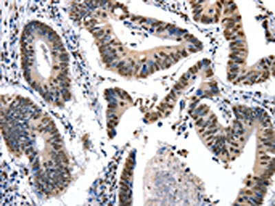 The image on the left is immunohistochemistry of paraffin-embedded Human colon cancer tissue using CSB-PA263929(KLK7 Antibody) at dilution 1/10, on the right is treated with fusion protein. (Original magnification: ×200)
