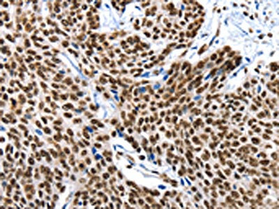 The image on the left is immunohistochemistry of paraffin-embedded Human esophagus cancer tissue using CSB-PA263929(KLK7 Antibody) at dilution 1/10, on the right is treated with fusion protein. (Original magnification: ×200)