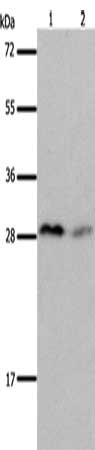 Gel: 12%SDS-PAGE, Lysate: 40 μg, Lane 1-2: Mouse brain tissue, Mouse kidney tissue, Primary antibody: CSB-PA263929(KLK7 Antibody) at dilution 1/600, Secondary antibody: Goat anti rabbit IgG at 1/8000 dilution, Exposure time: 20 seconds