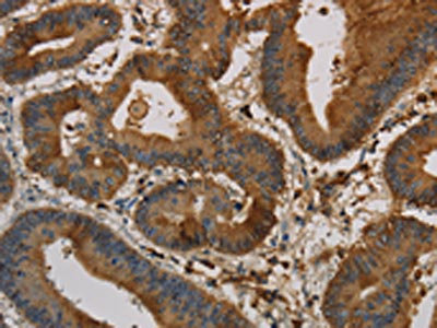 The image on the left is immunohistochemistry of paraffin-embedded Human colon cancer tissue using CSB-PA616691(KRT16 Antibody) at dilution 1/30, on the right is treated with synthetic peptide. (Original magnification: ×200)
