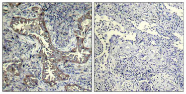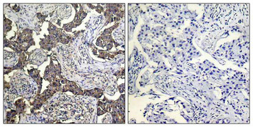 Immunohistochemical analysis of paraffin-embedded human Lung carcinoma tissue using BAD (Phospho-Ser112) Antibody (left) or the same antibody preincubated with blocking peptide (right).