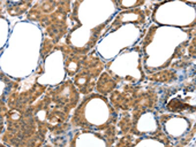 • The image on the left is immunohistochemistry of paraffin-embedded Human thyroid cancer tissue using CSB-PA698457(LAMA4 Antibody) at dilution 1/30, on the right is treated with fusion protein. (Original magnification: ×200)