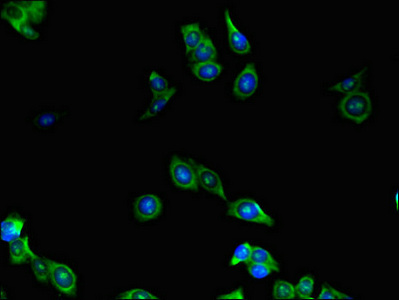 Immunofluorescent analysis of HepG2 cells using CSB-PA012856LA01HU at dilution of 1:100 and Alexa Fluor 488-congugated AffiniPure Goat Anti-Rabbit IgG(H+L)