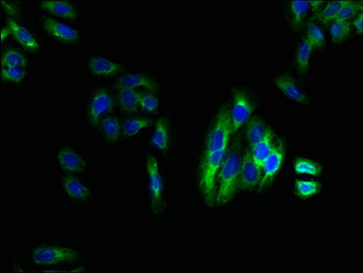 • Immunofluorescent analysis of HepG2 cells using CSB-PA013050LA01HU at dilution of 1:100 and Alexa Fluor 488-congugated AffiniPure Goat Anti-Rabbit IgG(H+L)