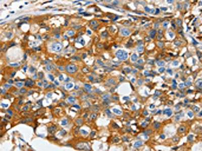 The image on the left is immunohistochemistry of paraffin-embedded Human breast cancer tissue using CSB-PA249658(LRP1 Antibody) at dilution 1/50, on the right is treated with synthetic peptide. (Original magnification: ×200)