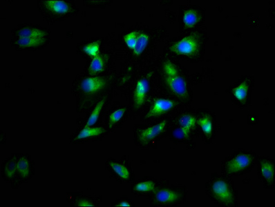 Immunofluorescence staining of Hela cells with CSB-PA08129A0Rb at 1:60, counter-stained with DAPI. The cells were fixed in 4% formaldehyde, permeabilized using 0.2% Triton X-100 and blocked in 10% normal Goat Serum. The cells were then incubated with the antibody overnight at 4°C. The secondary antibody was Alexa Fluor 488-congugated AffiniPure Goat Anti-Rabbit IgG(H+L).