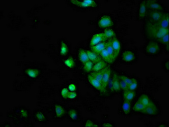 Immunofluorescence staining of HepG2 cells with CSB-PA013230LA01HU at 1:66, counter-stained with DAPI. The cells were fixed in 4% formaldehyde, permeabilized using 0.2% Triton X-100 and blocked in 10% normal Goat Serum. The cells were then incubated with the antibody overnight at 4°C. The secondary antibody was Alexa Fluor 488-congugated AffiniPure Goat Anti-Rabbit IgG(H+L).