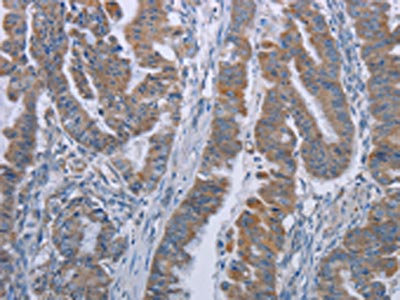 The image on the left is immunohistochemistry of paraffin-embedded Human thyroid cancer tissue using CSB-PA098019(LYN Antibody) at dilution 1/20, on the right is treated with fusion protein. (Original magnification: ×200)