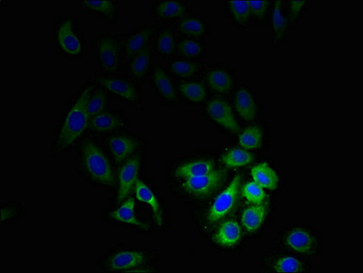 Immunofluorescent analysis of HepG2 cells using CSB-PA02625A0Rb at dilution of 1:100 and Alexa Fluor 488-congugated AffiniPure Goat Anti-Rabbit IgG(H+L)