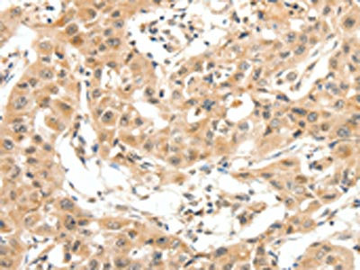• The image on the left is immunohistochemistry of paraffin-embedded Human lung cancer tissue using CSB-PA206897(MAP3K14 Antibody) at dilution 1/20, on the right is treated with fusion protein. (Original magnification: ×200)