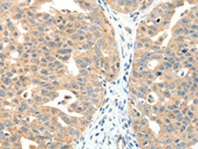 • The image on the left is immunohistochemistry of paraffin-embedded Human ovarian cancer tissue using CSB-PA206897(MAP3K14 Antibody) at dilution 1/20, on the right is treated with fusion protein. (Original magnification: ×200)