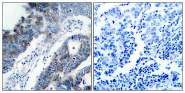 • Immunohistochemical analysis of paraffin-embedded human breast carcinoma tissue using ASK1(Ab-83) Antibody(left) or the same antibody preincubated with blocking peptide(right).