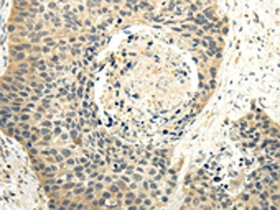 • The image on the left is immunohistochemistry of paraffin-embedded Human esophagus cancer tissue using CSB-PA245350(MAP3K7 Antibody) at dilution 1/20, on the right is treated with fusion protein. (Original magnification: ×200)