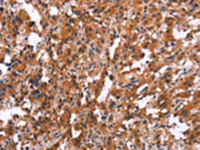 • The image on the left is immunohistochemistry of paraffin-embedded Human thyroid cancer tissue using CSB-PA928010(MAPK11 Antibody) at dilution 1/15, on the right is treated with synthetic peptide. (Original magnification: ×200)
