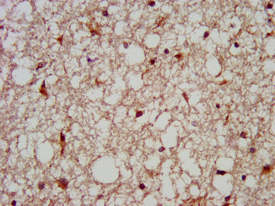IHC image of CSB-PA013560LA01HU diluted at 1:200 and staining in paraffin-embedded human brain tissue performed on a Leica BondTM system. After dewaxing and hydration, antigen retrieval was mediated by high pressure in a citrate buffer (pH 6.0). Section was blocked with 10% normal goat serum 30min at RT. Then primary antibody (1% BSA) was incubated at 4°C overnight. The primary is detected by a biotinylated secondary antibody and visualized using an HRP conjugated SP system.