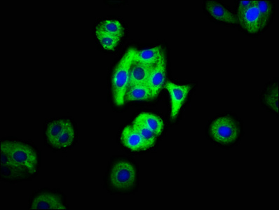 Immunofluorescence staining of HepG2 cells with CSB-PA013560LA01HU at 1:66, counter-stained with DAPI. The cells were fixed in 4% formaldehyde, permeabilized using 0.2% Triton X-100 and blocked in 10% normal Goat Serum. The cells were then incubated with the antibody overnight at 4°C. The secondary antibody was Alexa Fluor 488-congugated AffiniPure Goat Anti-Rabbit IgG(H+L).