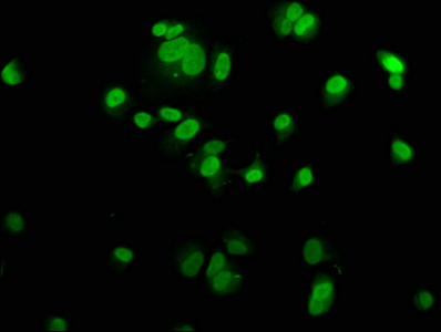 • Immunofluorescence staining of MCF-7 cells with CSB-PA013590LA01HU at 1:200, counter-stained with DAPI. The cells were fixed in 4% formaldehyde, permeabilized using 0.2% Triton X-100 and blocked in 10% normal Goat Serum. The cells were then incubated with the antibody overnight at 4°C. The secondary antibody was Alexa Fluor 488-congugated AffiniPure Goat Anti-Rabbit IgG(H+L).