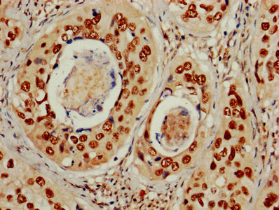 • IHC image of CSB-PA013590LA01HU diluted at 1:600 and staining in paraffin-embedded human cervical cancer performed on a Leica BondTM system. After dewaxing and hydration, antigen retrieval was mediated by high pressure in a citrate buffer (pH 6.0). Section was blocked with 10% normal goat serum 30min at RT. Then primary antibody (1% BSA) was incubated at 4°C overnight. The primary is detected by a biotinylated secondary antibody and visualized using an HRP conjugated SP system.