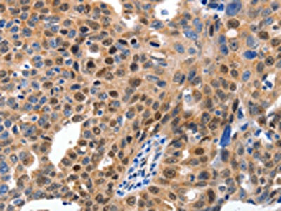 The image on the left is immunohistochemistry of paraffin-embedded Human ovarian cancer tissue using CSB-PA811751(MCM7 Antibody) at dilution 1/15, on the right is treated with fusion protein. (Original magnification: ×200)