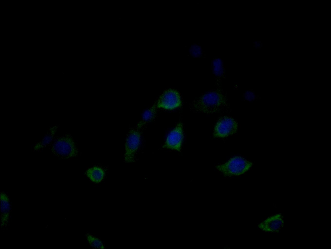 Immunofluorescence staining of MCF-7 cells with CSB-PA704858ESR1HU at 1:25, counter-stained with DAPI. The cells were fixed in 4% formaldehyde, permeabilized using 0.2% Triton X-100 and blocked in 10% normal Goat Serum. The cells were then incubated with the antibody overnight at 4°C. The secondary antibody was Alexa Fluor 488-congugated AffiniPure Goat Anti-Rabbit IgG(H+L).