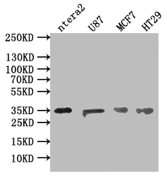 Positive WB detected in: NTERA-2 whole cell lysate, U87 whole cell lysate, MCF7 whole cell lysate, HT29 whole cell lysate