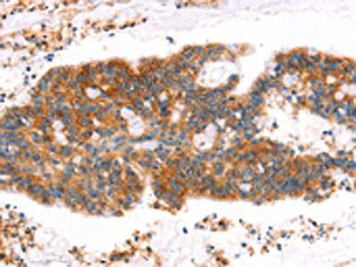 The image on the left is immunohistochemistry of paraffin-embedded Human colon cancer tissue using CSB-PA076189(MLLT4 Antibody) at dilution 1/40, on the right is treated with synthetic peptide. (Original magnification: ×200)