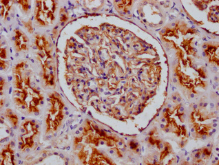 IHC image of CSB-PA014653LA01HU diluted at 1:100 and staining in paraffin-embedded human kidney tissue performed on a Leica BondTM system. After dewaxing and hydration, antigen retrieval was mediated by high pressure in a citrate buffer (pH 6.0). Section was blocked with 10% normal goat serum 30min at RT. Then primary antibody (1% BSA) was incubated at 4°C overnight. The primary is detected by a Goat anti-rabbit polymer IgG labeled by HRP and visualized using 0.05% DAB.