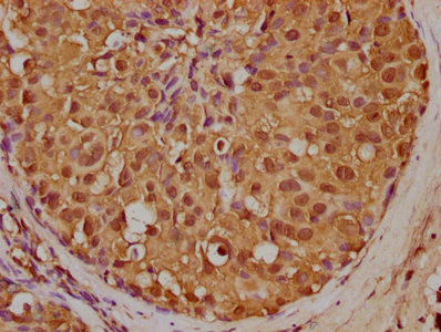 IHC image of CSB-PA014666LA01HU diluted at 1:200 and staining in paraffin-embedded human breast cancer performed on a Leica BondTM system. After dewaxing and hydration, antigen retrieval was mediated by high pressure in a citrate buffer (pH 6.0). Section was blocked with 10% normal goat serum 30min at RT. Then primary antibody (1% BSA) was incubated at 4°C overnight. The primary is detected by a biotinylated secondary antibody and visualized using an HRP conjugated SP system.