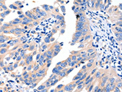 The image on the left is immunohistochemistry of paraffin-embedded Human lung cancer tissue using CSB-PA293957(MSTN Antibody) at dilution 1/8, on the right is treated with synthetic peptide. (Original magnification: ×200)