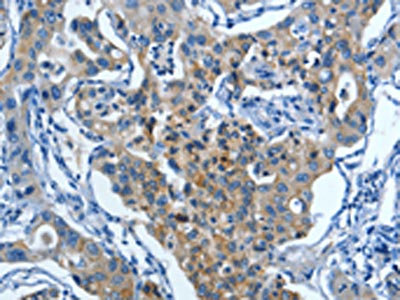 The image on the left is immunohistochemistry of paraffin-embedded Human lung cancer tissue using CSB-PA113113(MUC15 Antibody) at dilution 1/50, on the right is treated with fusion protein. (Original magnification: ×200)