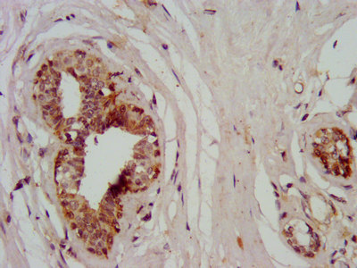 IHC image of CSB-PA015291LA01HU diluted at 1:400 and staining in paraffin-embedded human breast cancer performed on a Leica BondTM system. After dewaxing and hydration, antigen retrieval was mediated by high pressure in a citrate buffer (pH 6.0). Section was blocked with 10% normal goat serum 30min at RT. Then primary antibody (1% BSA) was incubated at 4°C overnight. The primary is detected by a biotinylated secondary antibody and visualized using an HRP conjugated SP system.