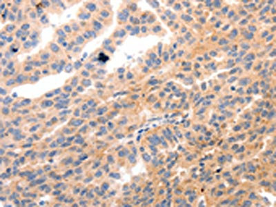 • The image on the left is immunohistochemistry of paraffin-embedded Human ovarian cancer tissue using CSB-PA926395(MYL9 Antibody) at dilution 1/80, on the right is treated with synthetic peptide. (Original magnification: ×200)